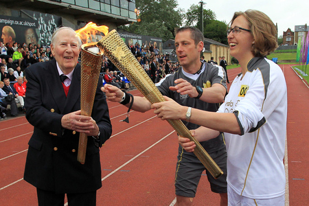 Sir Roger Bannister had his turn carrying the Olympic Flame at the start of day 53 of the Torch Relay. (Photo by LOCOG via Getty Images)