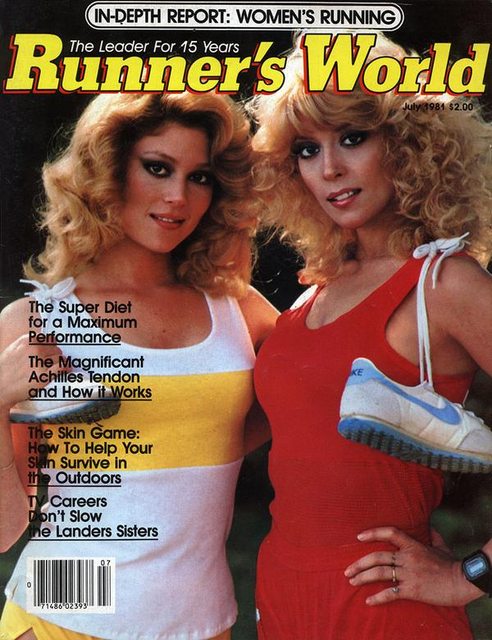 The cover of the July 1981 issue of Runner's World advertises an in-depth report on women's running, both in text and graphics, but most prominently with the latter. Judy and Audrey Landers, famous sisters who worked in film and television in the late 1970s and early 1980s, pose together in 80s-era flair and hair.